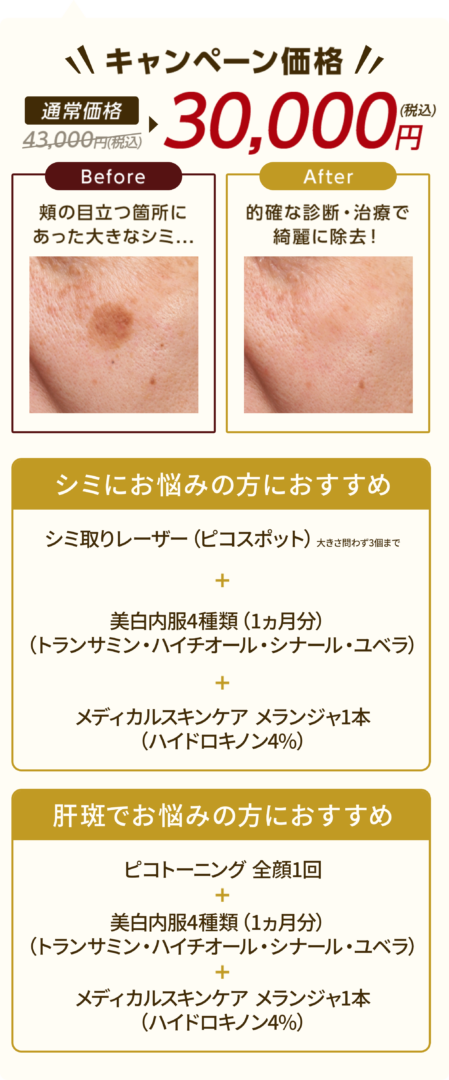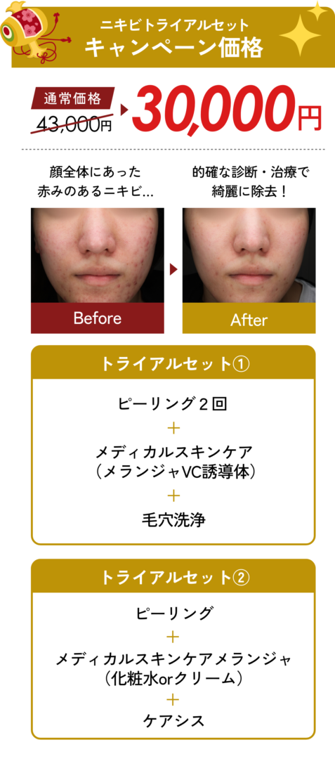 | ケミカルピーリング:サリチル酸マクロゴールを使用するため、痛みや赤みが出るなどの心配はほとんどありません。 ケアシス:赤み、腫れ、乾燥が一時的に生じることがあります。稀に、アレルギー反応や色素沈着が起こる可能性があります。 ・ライムライト:肌が生まれ変わる過程で一時的にシミが濃くなる場合がありますが、1週間程度で徐々に薄くなり始めます。 ・医療脱毛:まれに赤みが生じますが、数時間から数日ほどで落ち着きます。 ・ヒアルロン酸:軽い腫れや赤み、内出血が見られることがありますが、数日で自然に治まります。痛みや異物感も一時的です。 ・二重埋没法:皮下出血が起こることもありますが、数日から2週間程度で落ち着きます。軽度な腫れもみられますが、1~2週間で引きます。 ・切らない目の下の脂肪取り(脱脂):腫れ・内出血・目がかすむ※術後2~3日は泣いた後のような、むくみが生じる場合があります。 |