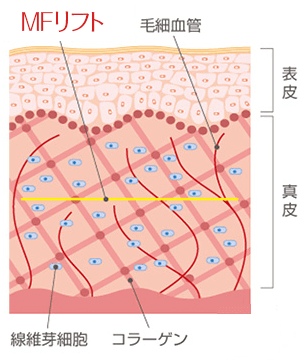 しわ・たるみの原因は、真皮層のコラーゲンの衰えです。真皮層に、MFリフトという新しい糸コラーゲンを埋入する治療法です。真皮層の線維芽細胞も活性化されますので、新たなコラーゲンも誕生し、張りのある美肌が生まれます。MFリフトは、マトリックスファイバーの略で、ハートライフクリニックオリジナル治療法です。